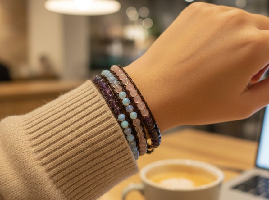 Materials: 4 mm Rose Quartz, Moonstone, Amethyst, Brown Leather