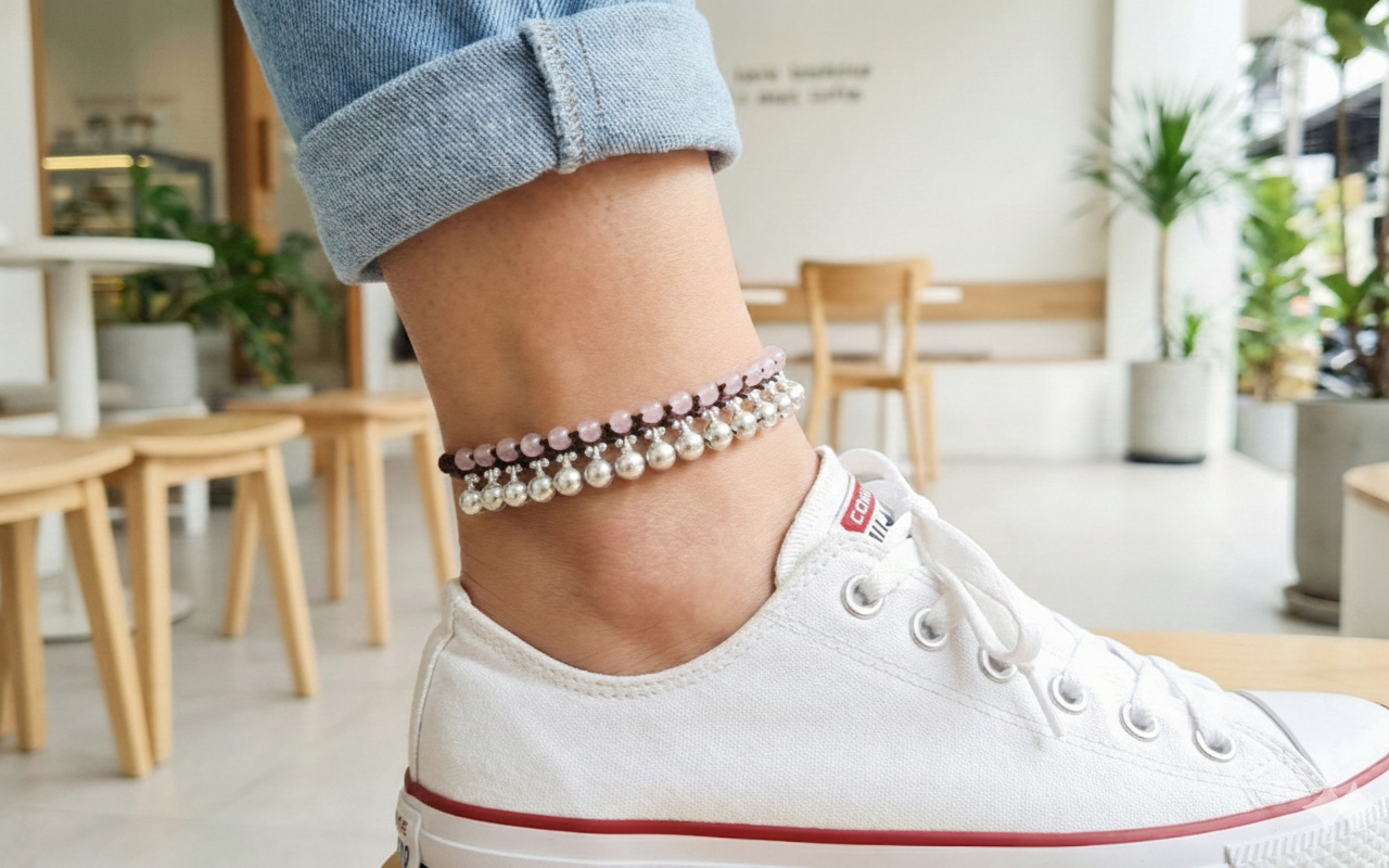 Jingling Rose Quartz Silver Stone Anklet Bracelet, Stone Bracelet, Bell Bracelet,Women Anklets, Gifts for Girls, Bells Anklets