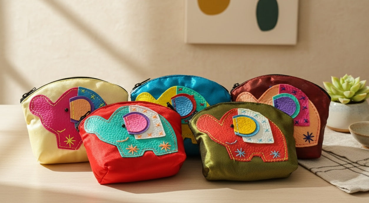 Jewelry Pouch , Set of 5 Handmade Silk Elephant Coin Purse With Zipper ,Gift, Women ,Elephant Pouch